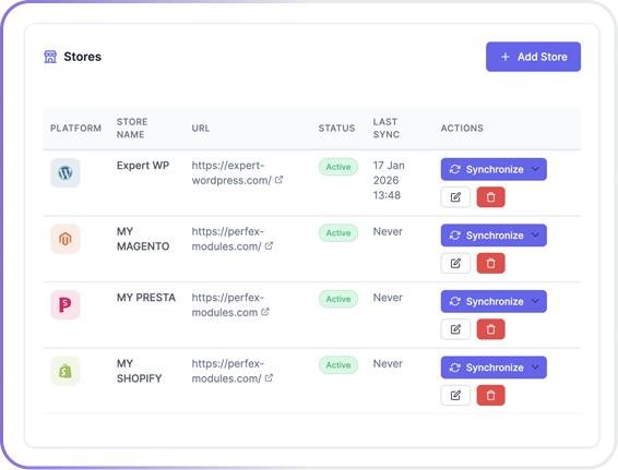 Multi-store management is smooth. We connected WooCommerce, Shopify, PrestaShop, and Magento stores without any issues. Sarah Lopez PrestaShop Expert 5.0